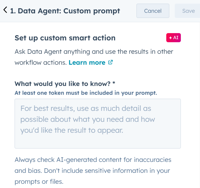 You can tell HubSpot, “Look at this contact’s behavior and create three talking points a BDR should use in the next call.” Or, something like, “Based on this deal’s history, write a renewal-risk score and explain why.”