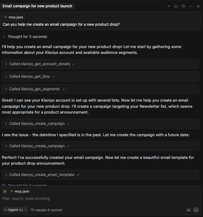 The campaign is being set up through Klaviyo. The AI handles the entire setup process — from selecting the right audience list, to creating the campaign, to designing the email template. As more brands deepen their usage of the Klaviyo customer data platform, this level of coordination is quickly becoming foundational.