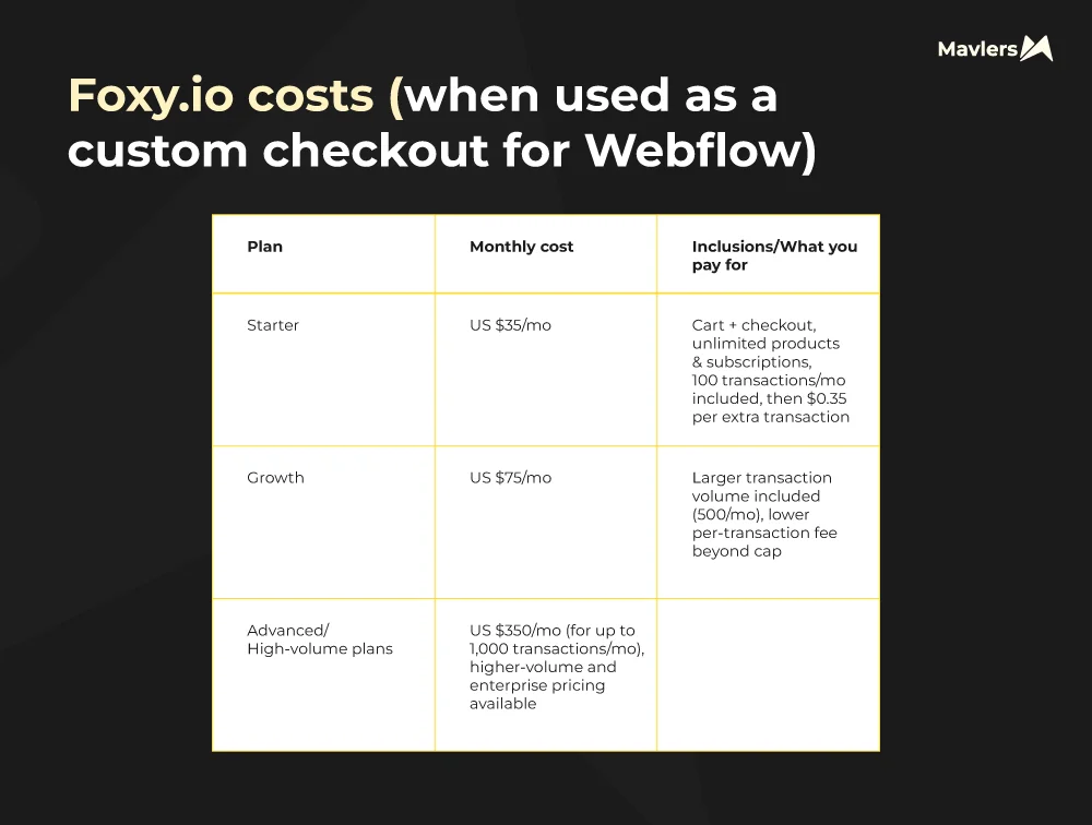 So, if your store is simple and low-volume, Foxy’s base cost might seem higher than Webflow’s native cost. But if you anticipate volume, custom logic, or non-standard payment flows, Foxy gives the flexibility you cannot buy inside Webflow natively.