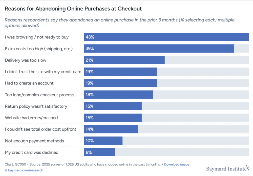 According to Baymard Institute’s latest research, the average documented online shopping cart abandonment rate is 70.22%. Also, 19% of them left their carts because they didn’t trust the site with their credit cards!