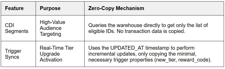 Using Braze’s Cloud Data Ingestion (CDI) Segments combined with incremental syncs via the Braze Data Partner platform allows you to use the data in place (zero-copy for segmentation) and only ingest minimal, necessary data for triggers—that’s Braze CDP integration in action.