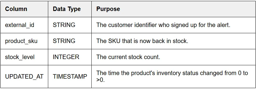 - The view only surfaces users who previously showed interest in a product_sku and whose corresponding stock_level has just increased from zero.